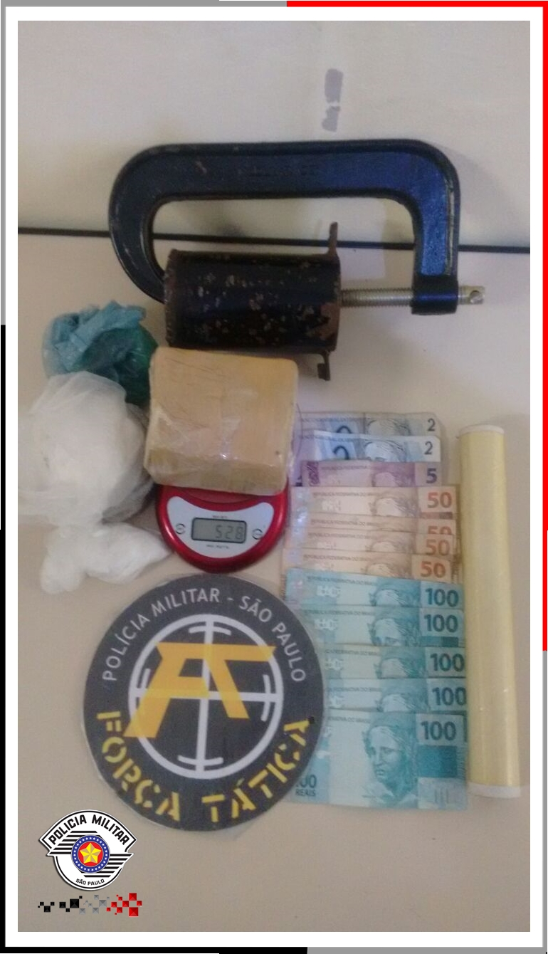 Após denuncia diretamente a equipe que um indivíduo estaria guardando drogas para outra pessoa,ao chegar no local situado no Jd. Empyreo, foram avistados dois indivíduos, ao serem abordados e revistados, foram localizados em poder dos mesmos cocaína a